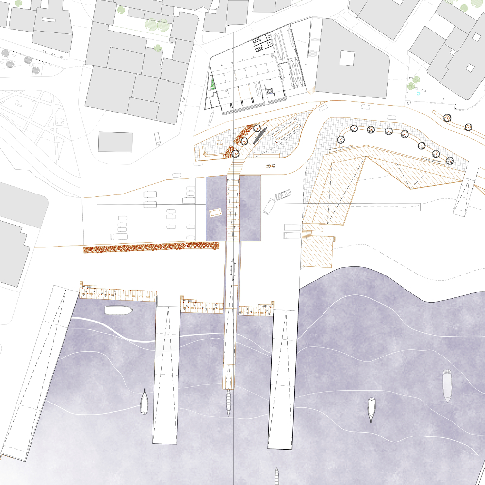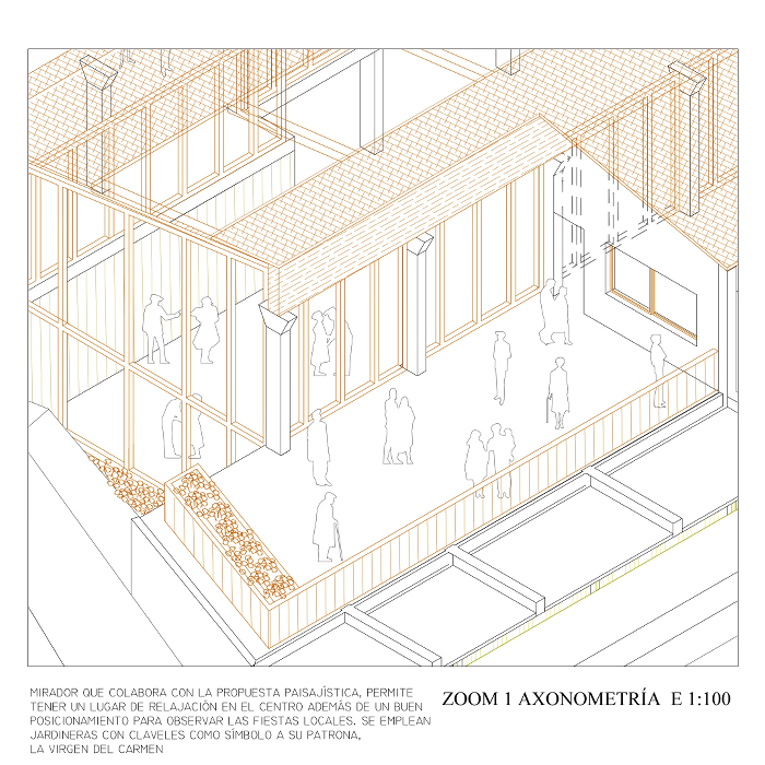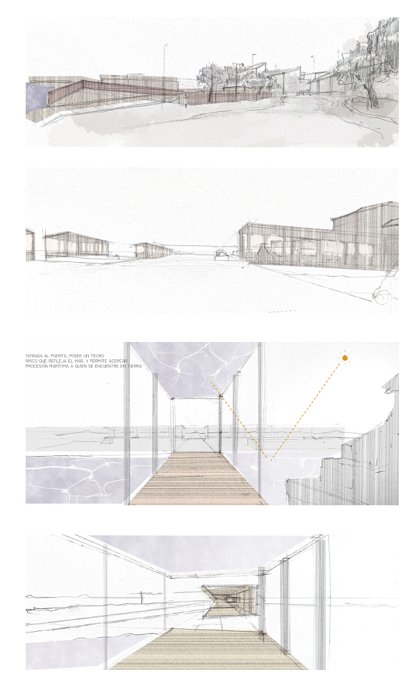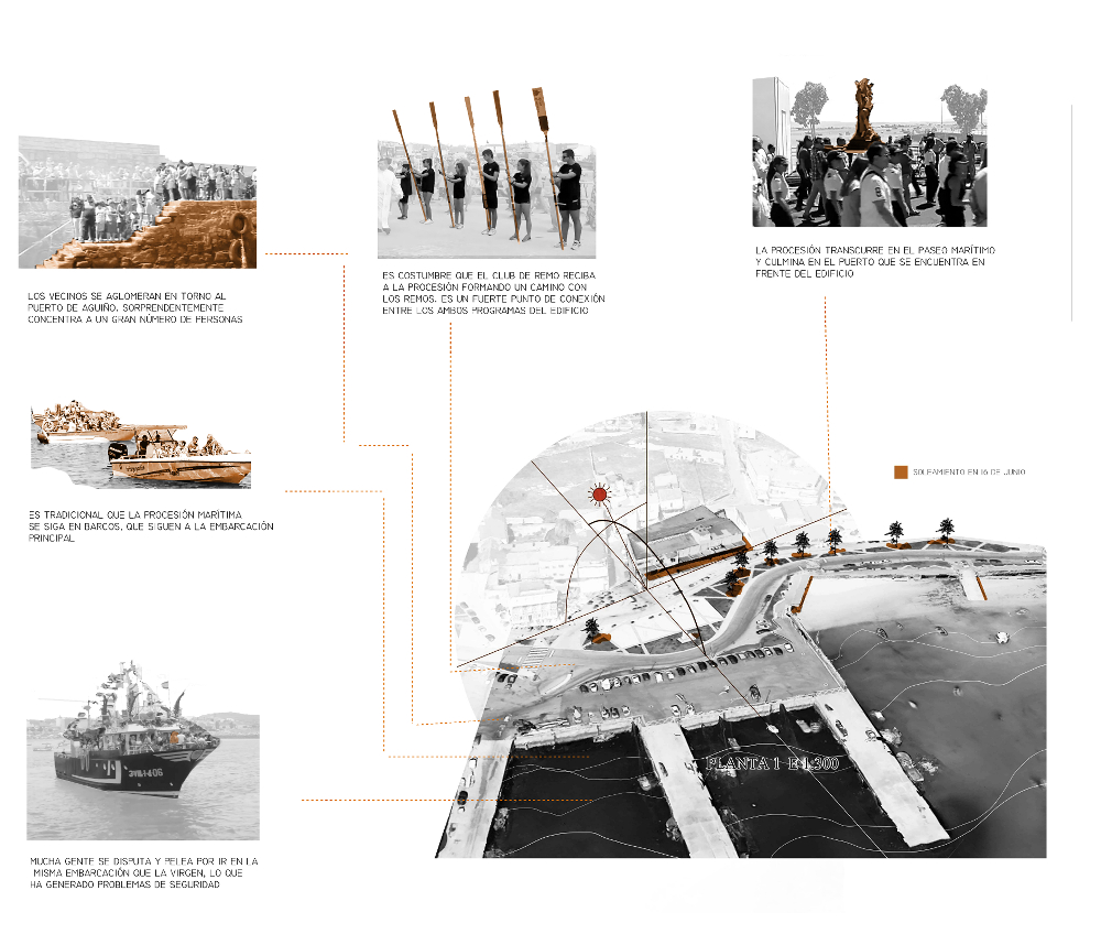 La estrategia del proyecto se basa en fortalecer aquellos aspectos que unen los dos programas del edificio, por ello, la propuesta del entorno se ha enfocado en revalorizar la experiencia de los días de fiesta en Aguiño. Cada banco y mirador están pensados para poder observar mejor las actividades del mar, como las regatas o la procesión marítima. Se ha adecuado el entorno para hacer más agradable la experiencia en tierra, acercando a la gente de Aguiño al mar.