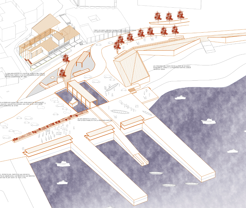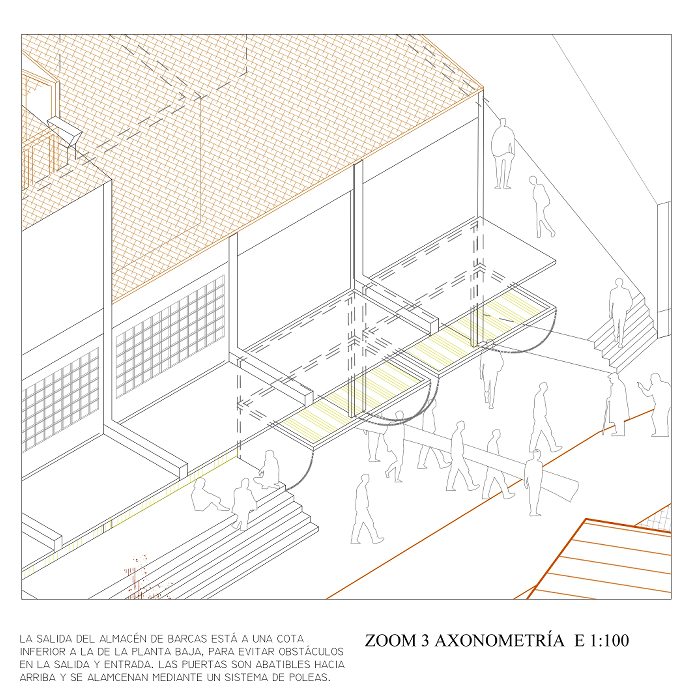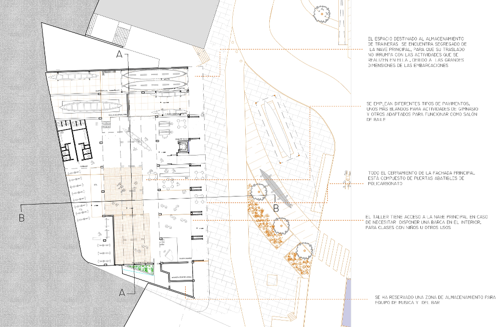 El proyecto busca segregar los programas de remo y centro social en dos volúmenes separados, unidos mediante una zona común central. Además, para favorecer la comunicación y fomentar la convivencia, toda la planta baja (salvo el taller)es permeable entre sí y con los espacios de la planta superior.