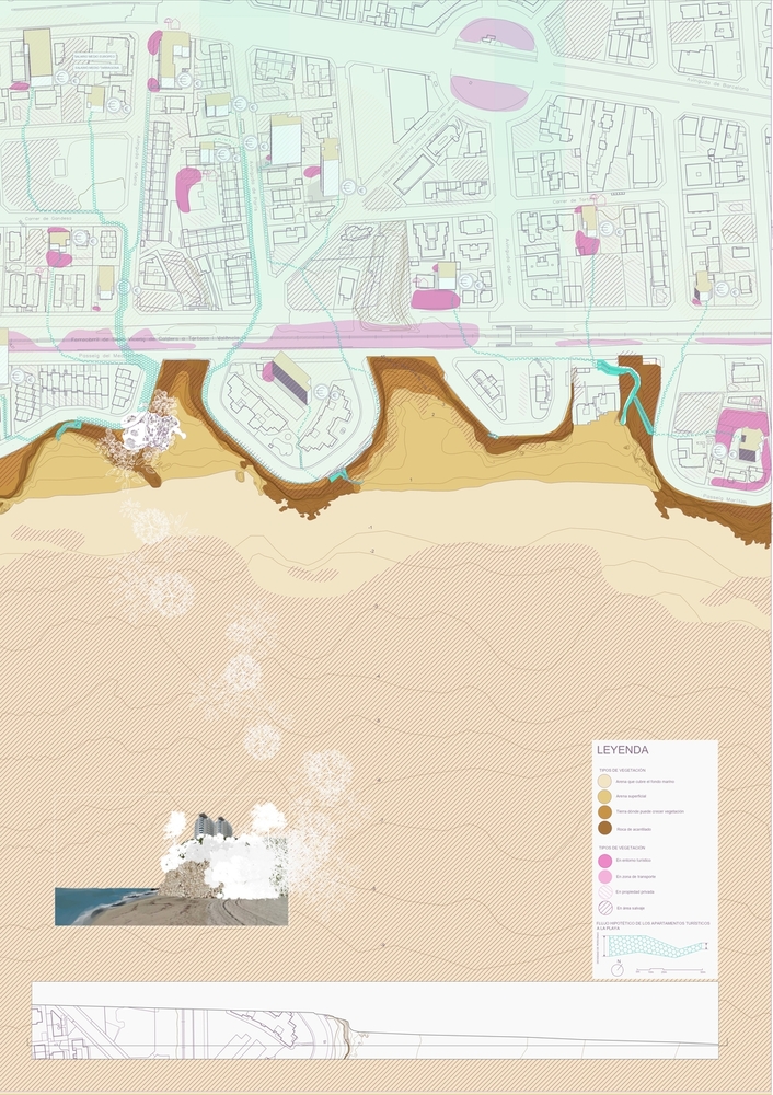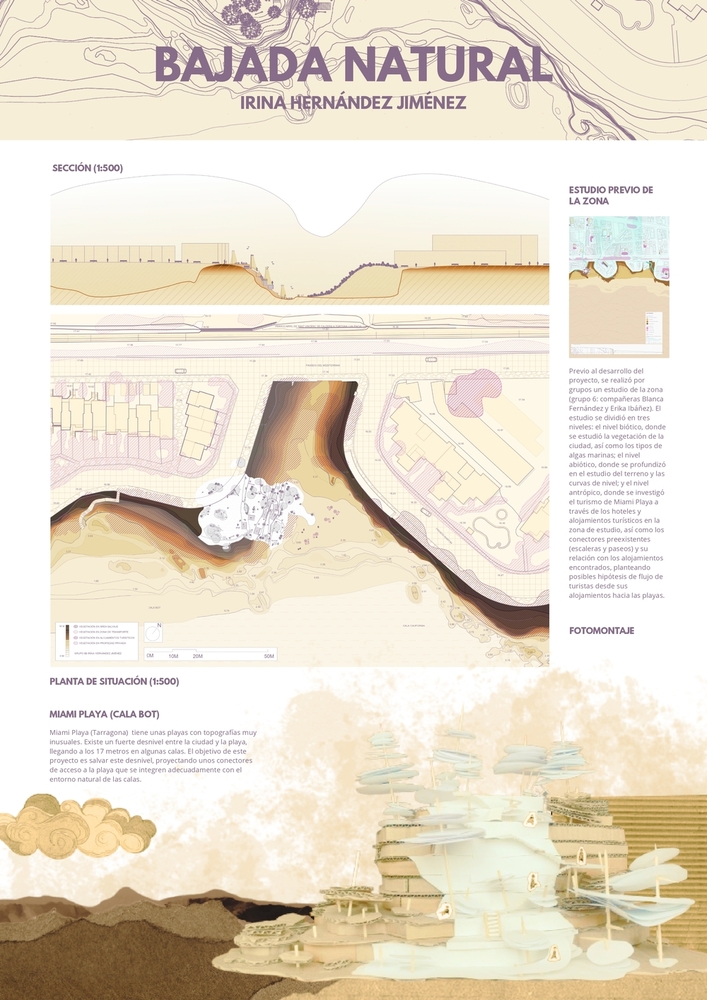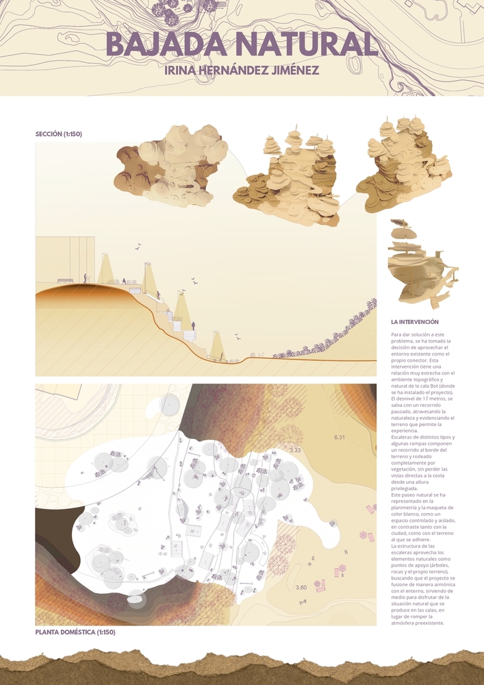 Este proyecto busca crear una bajada hasta la playa que interactúe con el entorno natural preexistente. Para ello, se diseñaron escaleras que se camuflaban con la vegetación y se sustentaban en el borde de la cala, configurando un recorrido natural en completa conexión con la naturaleza de la Cala Bot y su paisaje único.