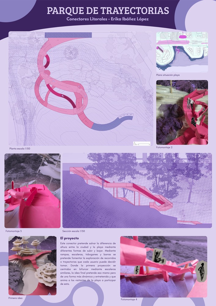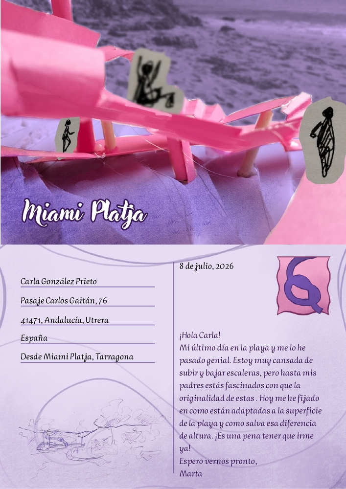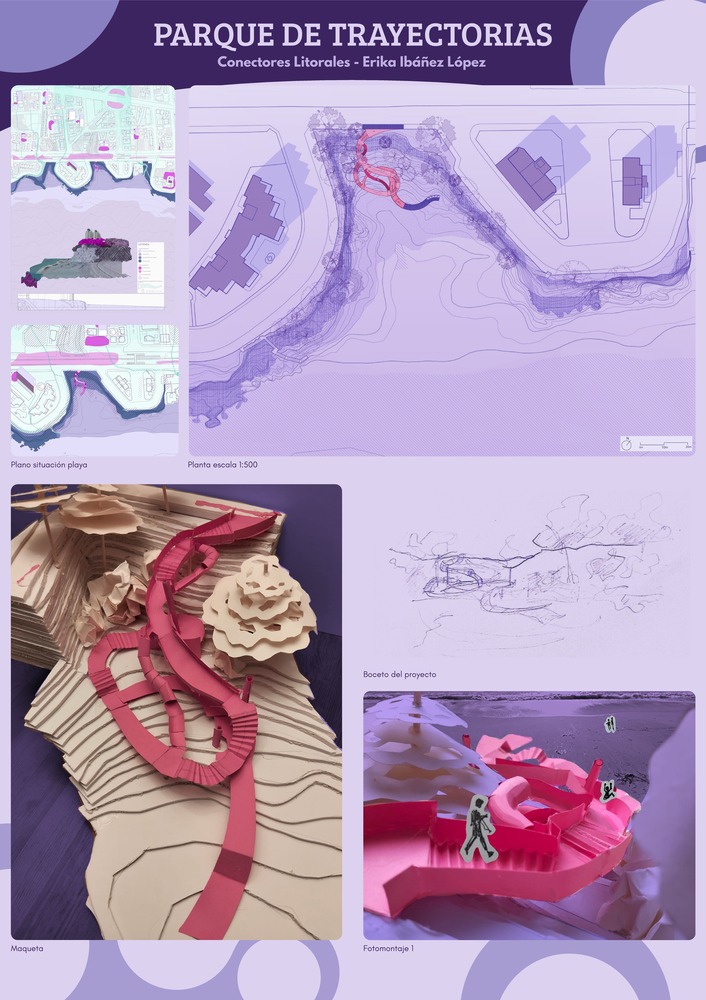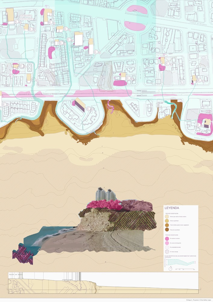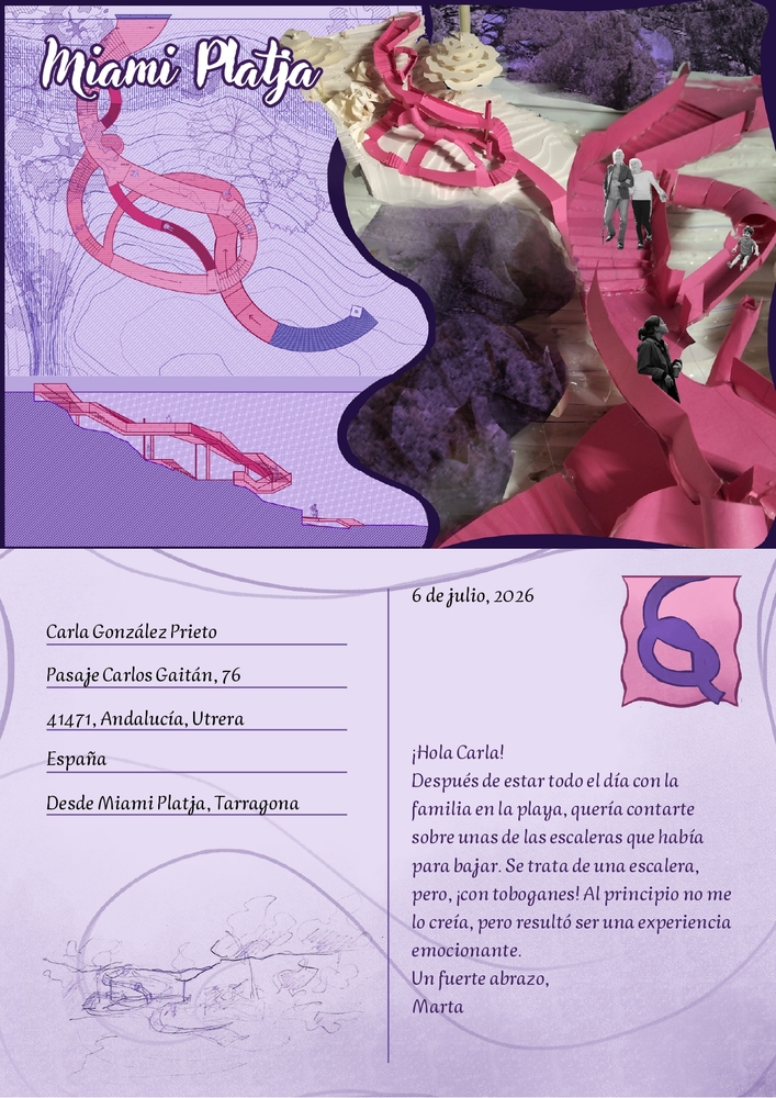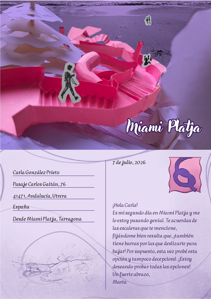 Erika Ibáñez López Mapa de situación de Miami Platja. Panel 1: Contexto (escala 1:500) y maqueta. Panel 2: Planta y sección (escala 1:150) y fotomontajes. Postal 1. Postal 2. Postal 3.