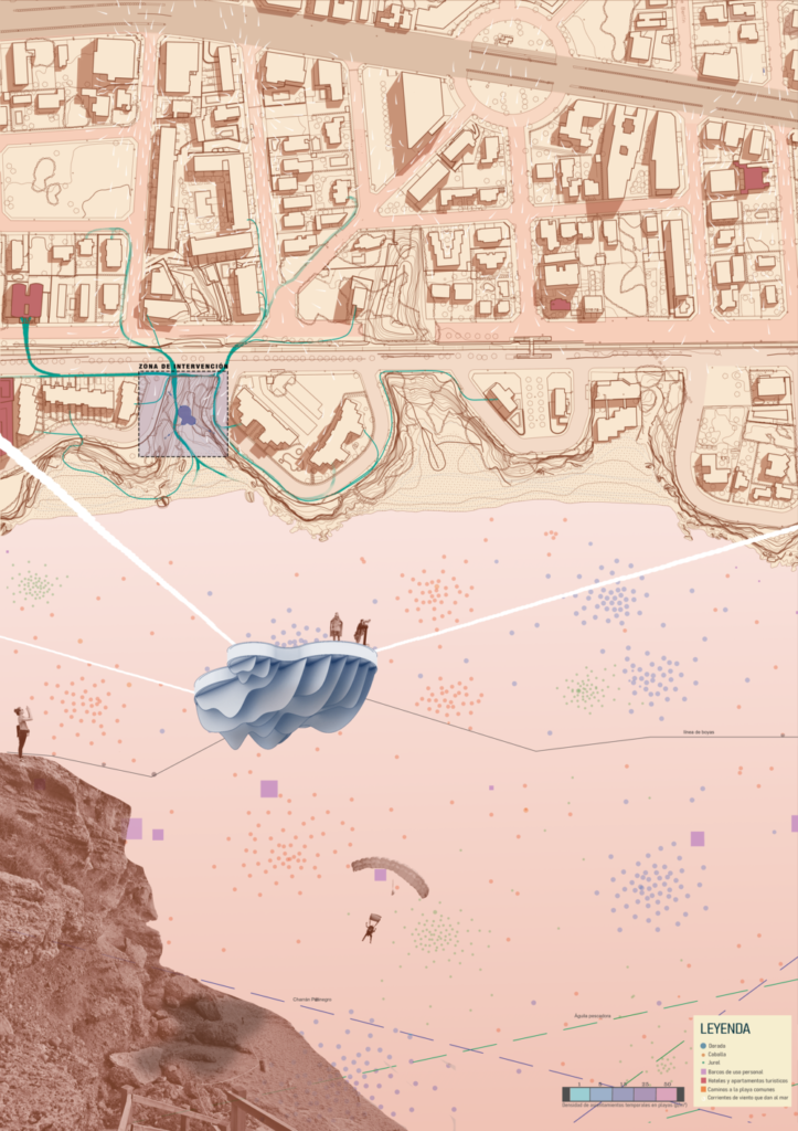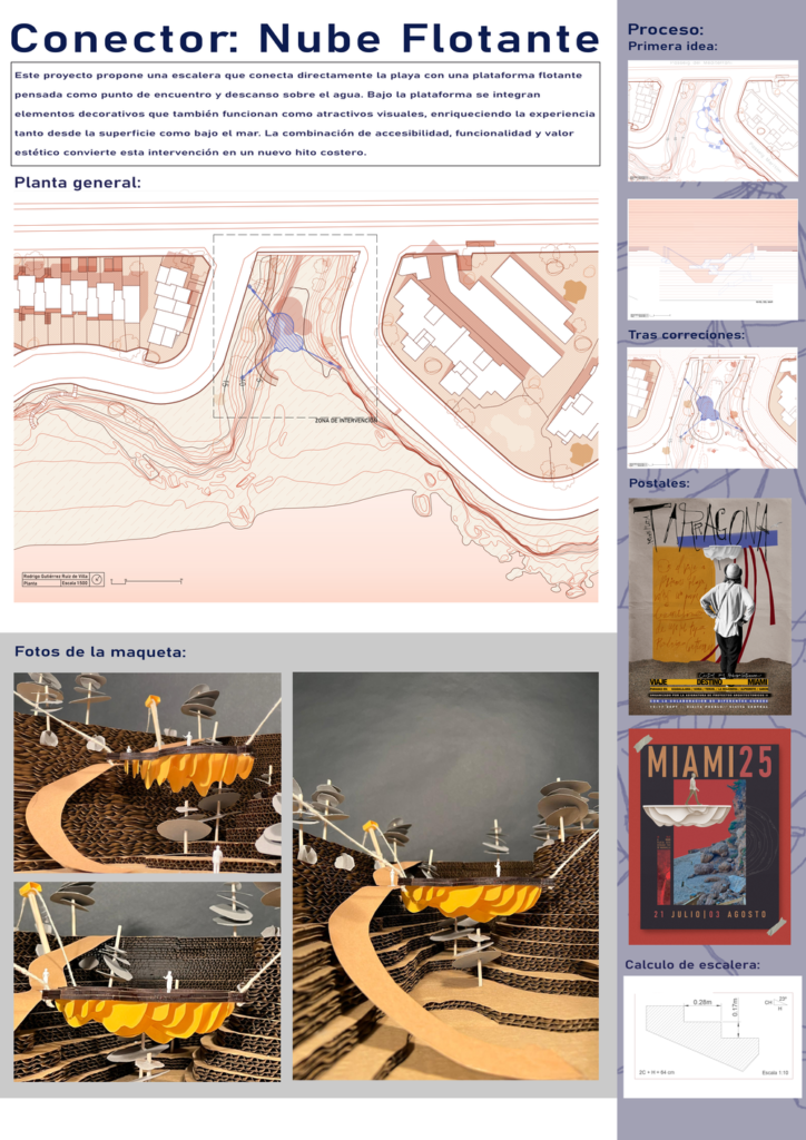 Este proyecto propone una escalera que conecta directamente la playa con una plataforma flotante pensada como punto de encuentro y descanso sobre el arena. Bajo la plataforma se integran elementos decorativos que también funcionan como atractivos visuales, enriqueciendo la experiencia tanto desde la superficie como en la playa. La combinación de funcionalidad y valor estético convierte esta intervención en un nuevo hito costero.