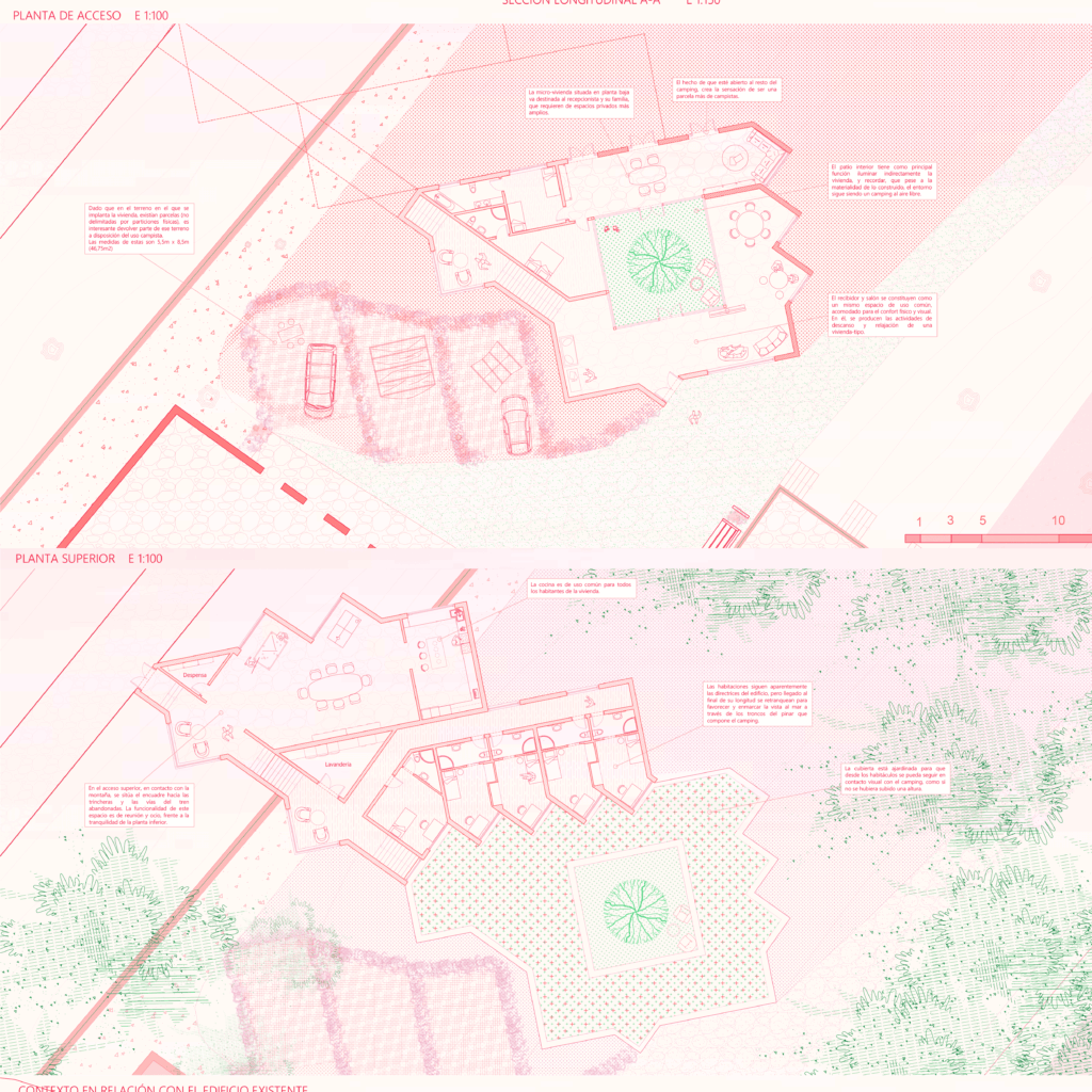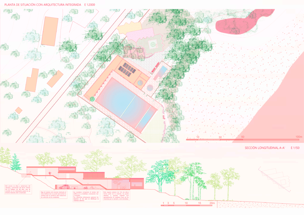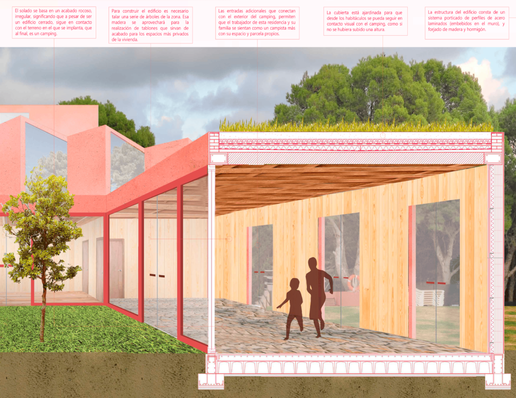 Además de funcionar como una vivienda para seis trabajadores del camping «El Templo del Sol», sirve como una unión física, un puente entre el pintoresco paseo que conforman las vías abandonadas del tren, y un acceso claro y lineal hacia la Costa Dorada.